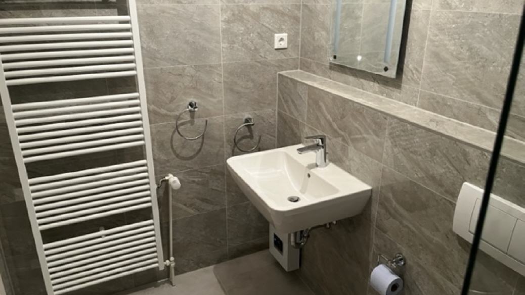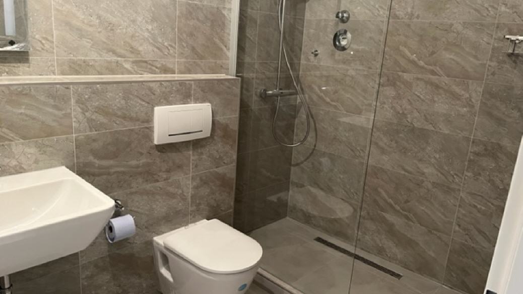 Das Badezimmer verfügt über eine begehbare Dusche und ist bis zur Decke gefliest.
